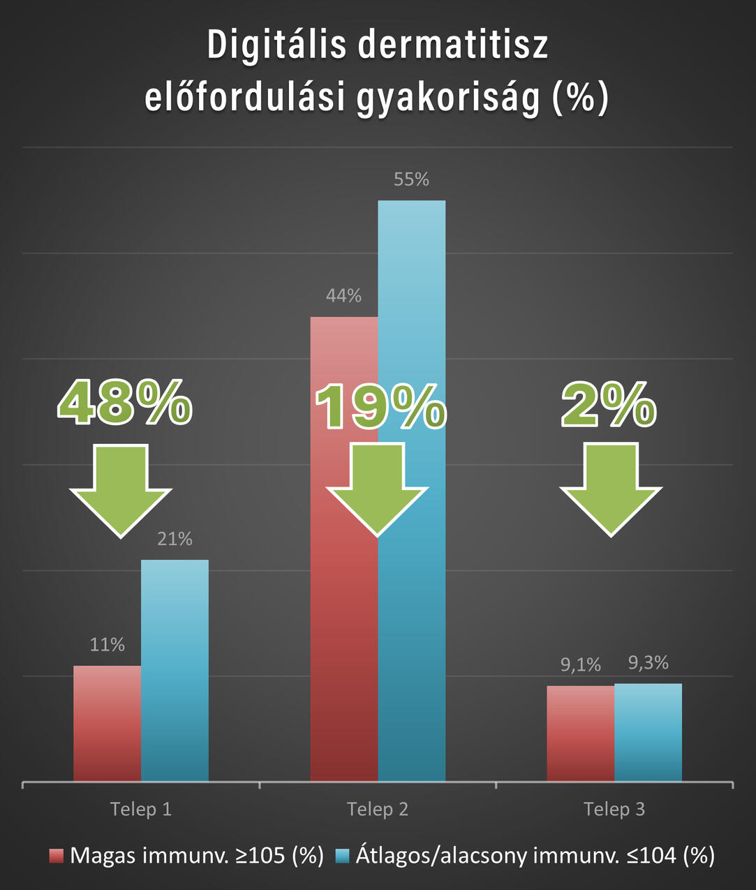A magas immunválasszal rendelkező teheneknél alacsonyabb a Mortellaro (digitális dermatitisz) és jelentősen ritkább a talpfekély előfordulása. Ez a különbség arra utal, hogy a magas immunválaszhoz kapcsolódó genetika nemcsak az általános egészségre, hanem a sántaságot befolyásoló lábvég-problémák kockázatára is kedvező hatással lehet. A gyakorlati előny: kevesebb sántasági eset, kevesebb beavatkozás