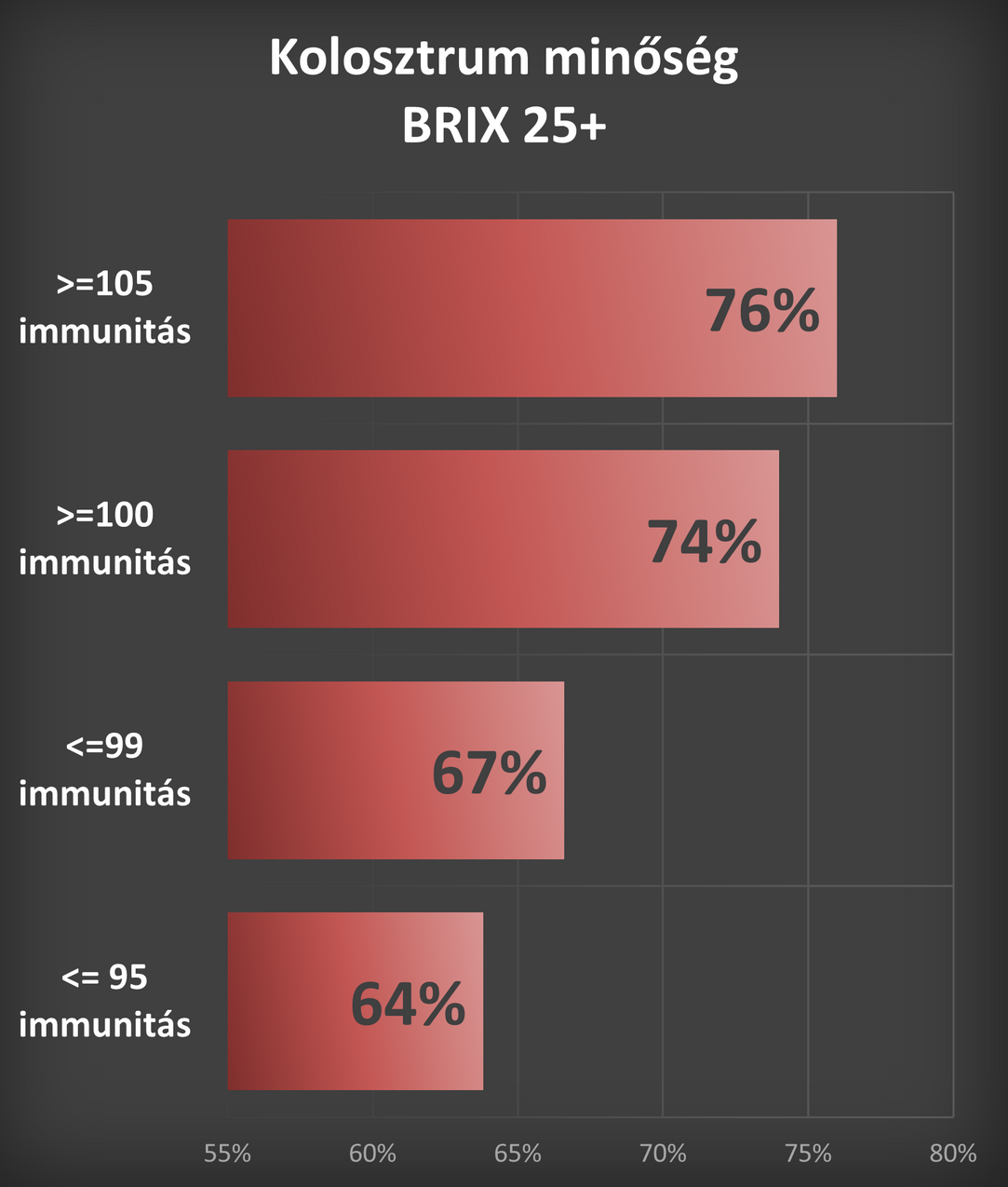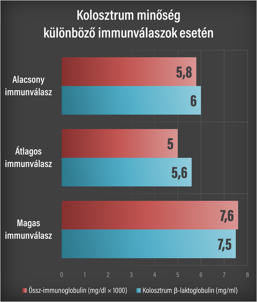 Több kísérlet is igazolta, hogy a magas immunválasz nemcsak az állat egészségi státuszában, hanem a föcstej minőségében is mérhetően megjelenhet. A magas immunválaszú egyedek esetén a kolosztrum β-laktoglobulin és össz-immunglobulin szintje is magasabb. BRIX skálán mérve a föcstej minőségét jól látható, hogy a 25 vagy az annál magasabb értékeket figyelembe véve a magas immunválasszal rendelkező egyedek itt is előnyben vannak átlagos vagy alacsony immunválaszú társaikhoz képest.
