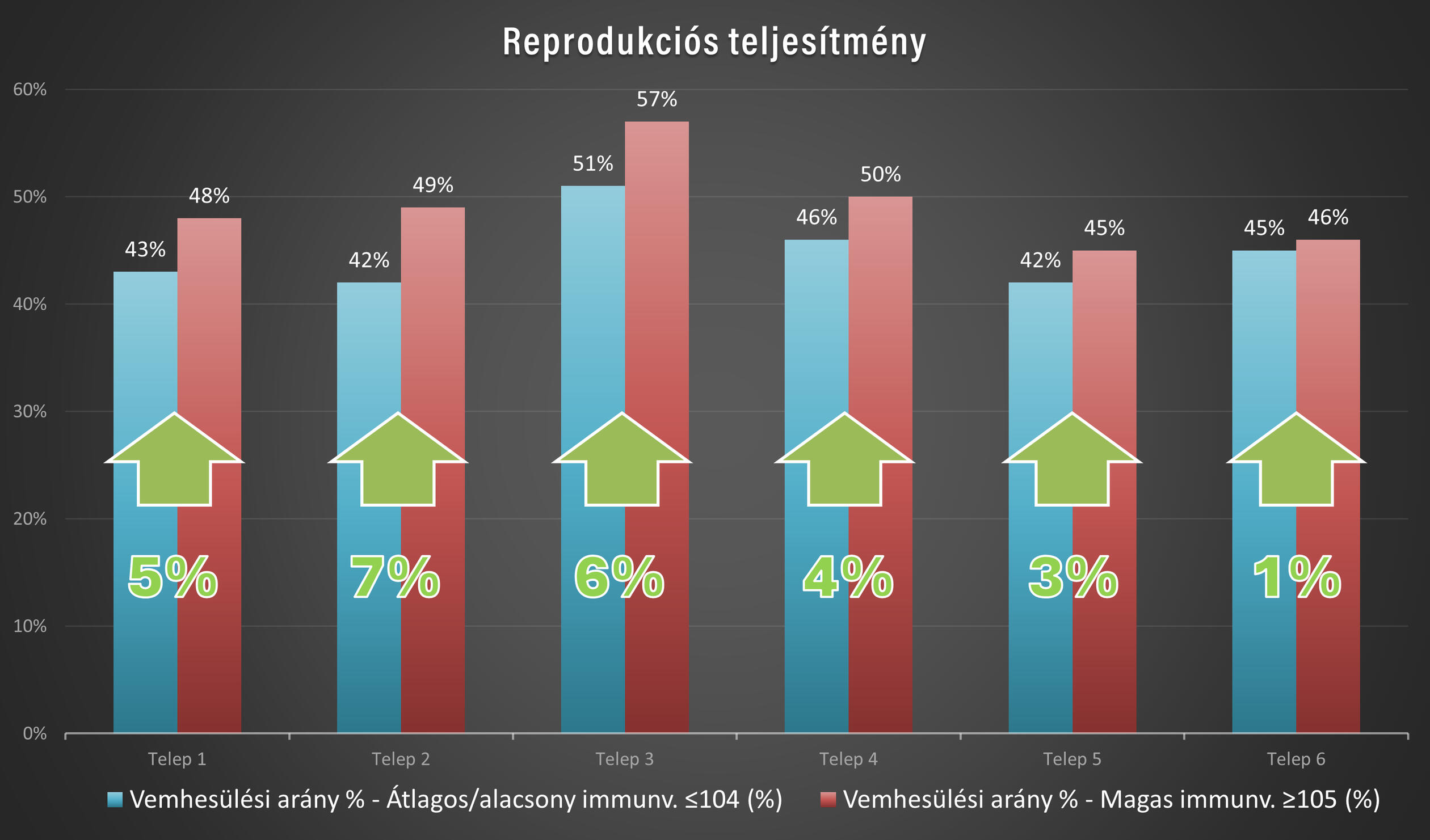 A magas Immunitás érték nemcsak egészségügyi előnyt adhat, hanem a fertilitási teljesítményt is támogathatja. Hat különböző telep több, mint 30000 termékenyítését vizsgálva egyértelműen kiderült, hogy a magasabb immunválaszú teheneknél jellemzően kisebb a rejtett egészségügyi terhelés és gyorsabb a regeneráció, ami jobb ivarzási aktivitást, pontosabb termékenyítést és magasabb vemhesülési arányt eredményezhet.