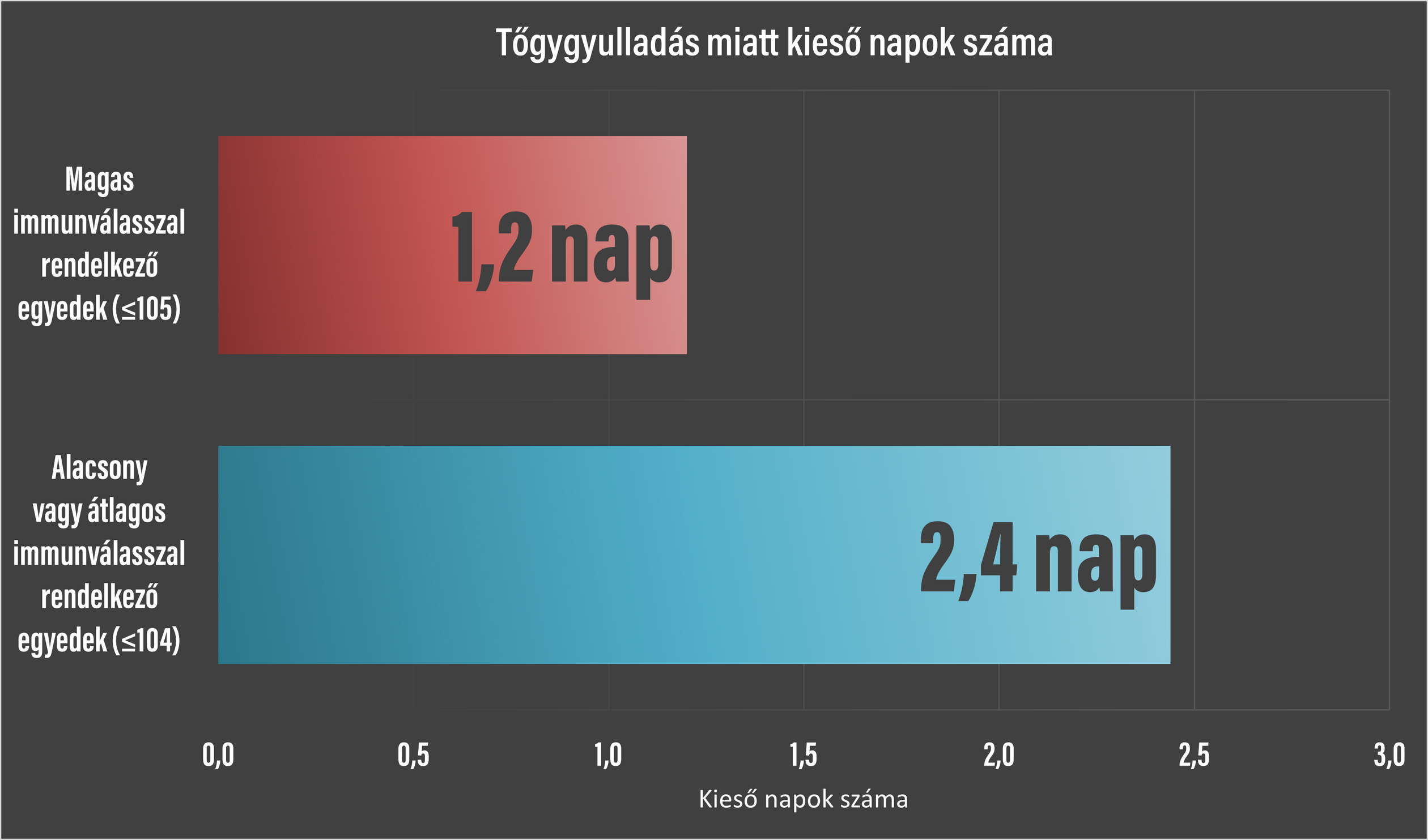 A magas Immunitás érték nemcsak az egészségben, hanem a termelésben is kézzelfogható előnyt adhat. Közel 8000, második laktációs (vagy annál idősebb) tehén adatait elemezték, és vizsgálták a tőgygyulladás miatt kieső (nem értékesíthető) napok számát. A magas immunválasszal (≥105) rendelkező csoportban ez a kiesés rövidebb volt, ez átlagosan +1,2 nappal több eladható tejet jelentett az istállótársaikhoz képest.