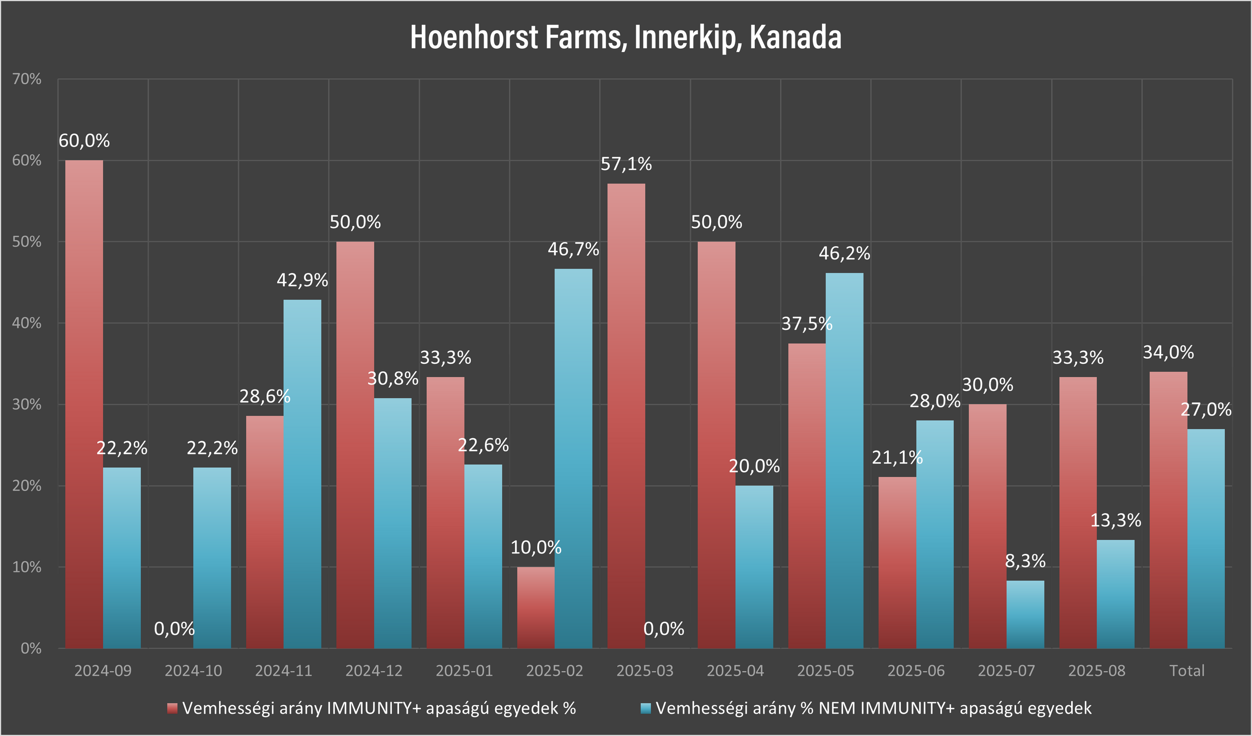 A Hoenhorst egy modern, robotizált fejési technológiára épülő tejtermelő telep, amely 320 hektár területen gazdálkodik, és jelenleg 490 tehenet fej. (305 nap: 12.000 kg tej, 4,2 zsír% és 3,2 fehérje%). Az első laktációs egyedek vemhesülési eredményeit vizsgálva látható, hogy az Immunity+ apaságú egyedek vemhesülési aránya 34%, míg a nem Immunity+ apaságú társaiké 27% – vagyis az Immunity+ tenyészbikák használata 7%, extra költségek nélküli javulást eredményezett a telepen.